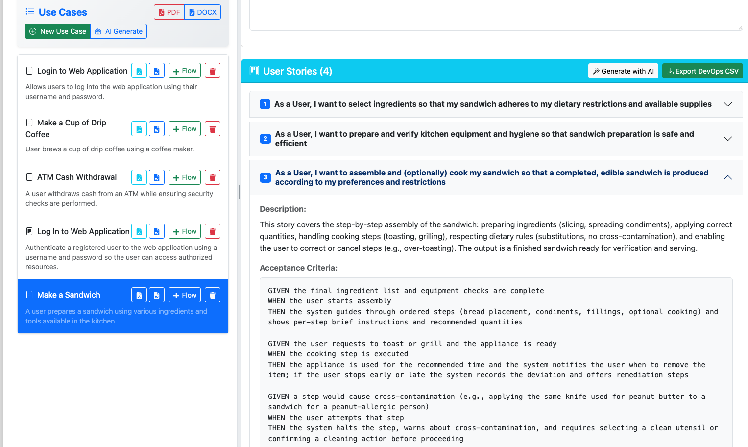 Then create corresponding draft user stories for each use case with a single click. With a few more clicks, export and bulk upload your user stories to Azure DevOps.